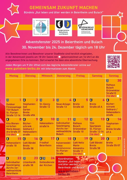 Am 30.11. eröffnet der Bürgerverein Bulach die Adventsfensteraktion 2025 mit dem Adventssingen im Rathausshof Bulach. Weitere Infos zur Aktion finden Sie hier.