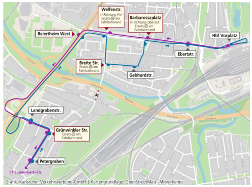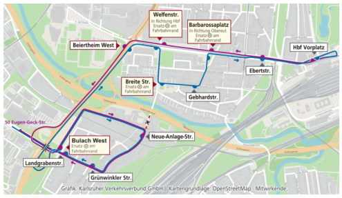 Die Haltestellen Neue-Anlage-Straße werden ab Montag, den 2. März, barrierefrei umgestaltet. Die Arbeiten dauern voraussichtlich bis Sonntag, den 19. April, an. In diesem Zeitraum werden die Haltestellen nicht von der Buslinien 50 bedient. Außerdem wird in der Zeit der Fahrbahnbelag der Litzenhardtstraße erneuert, weshalb im gesamten Zeitraum das Bulacher Loch für den KFZ-Verkehr gesperrt sein wird.